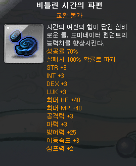 - 장비가 가지고 있는 공격력/마력/힘/덱/인/럭/방어력/이동속도/점프력/HP/MP가 확률에 따라 수치가 변동.